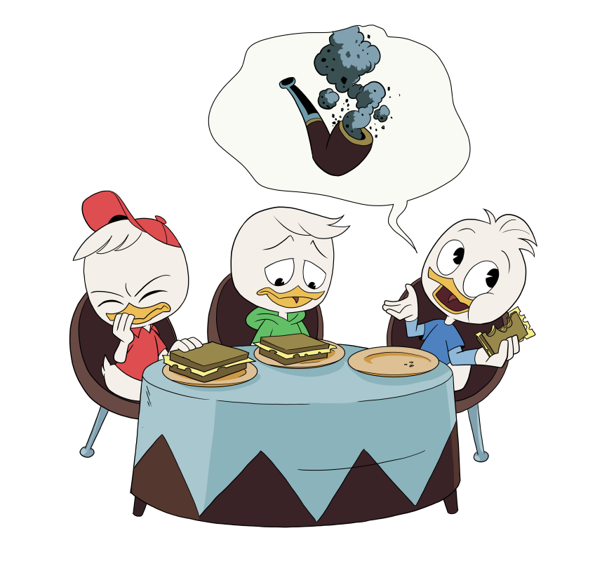 Here is my recreation of this drawing, through the filter of the fact that I liked it, using the boys’ designs from the 2017 DuckTales cartoon. Because, let’s face it. if anyone would thoughtlessly harp on about things that makes others feel nauseous without even realizing he’s doing anything wrong, it’s that incarnation of Dewey.