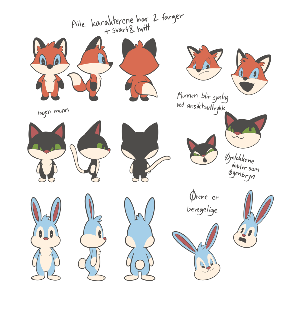 And finally, the fox. The fox was one of the original designs (the project leader had seen my Mikkel the Fox comic and wanted me to include a fox), but at this stage I thought: The fox is the only animal here that doesn’t actually belong on a farm. The dog, the cat, the pig, the chicken, even the rabbit… sure, you could see those on farms. But no farmer would be happy to see a fox on their farm.